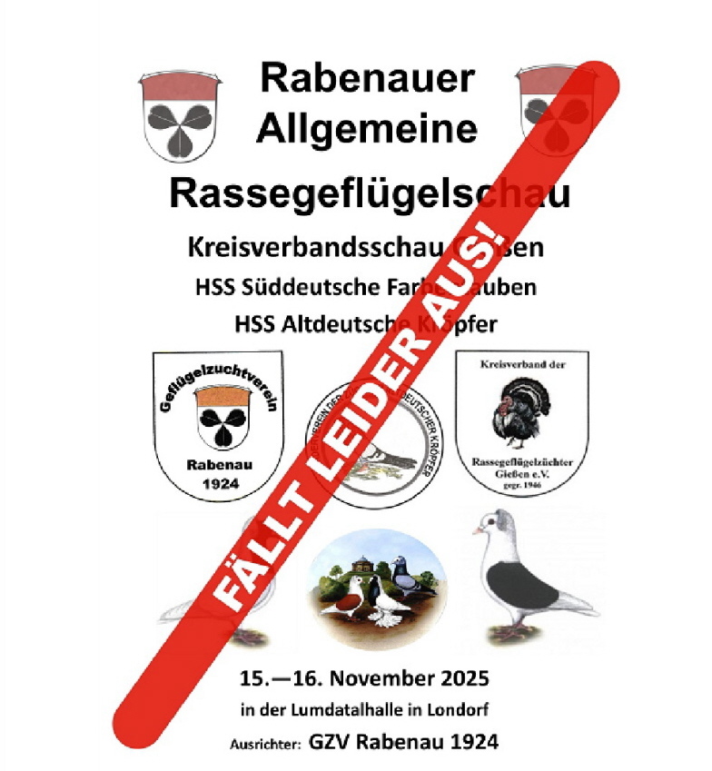 was wir schon befürchtet haben, ist jetzt leider eingetreten, unsere Hauptsonderschau in Rabenau muss wegen der zurzeit grassierenden Vogelgrippe leider ausfallen.